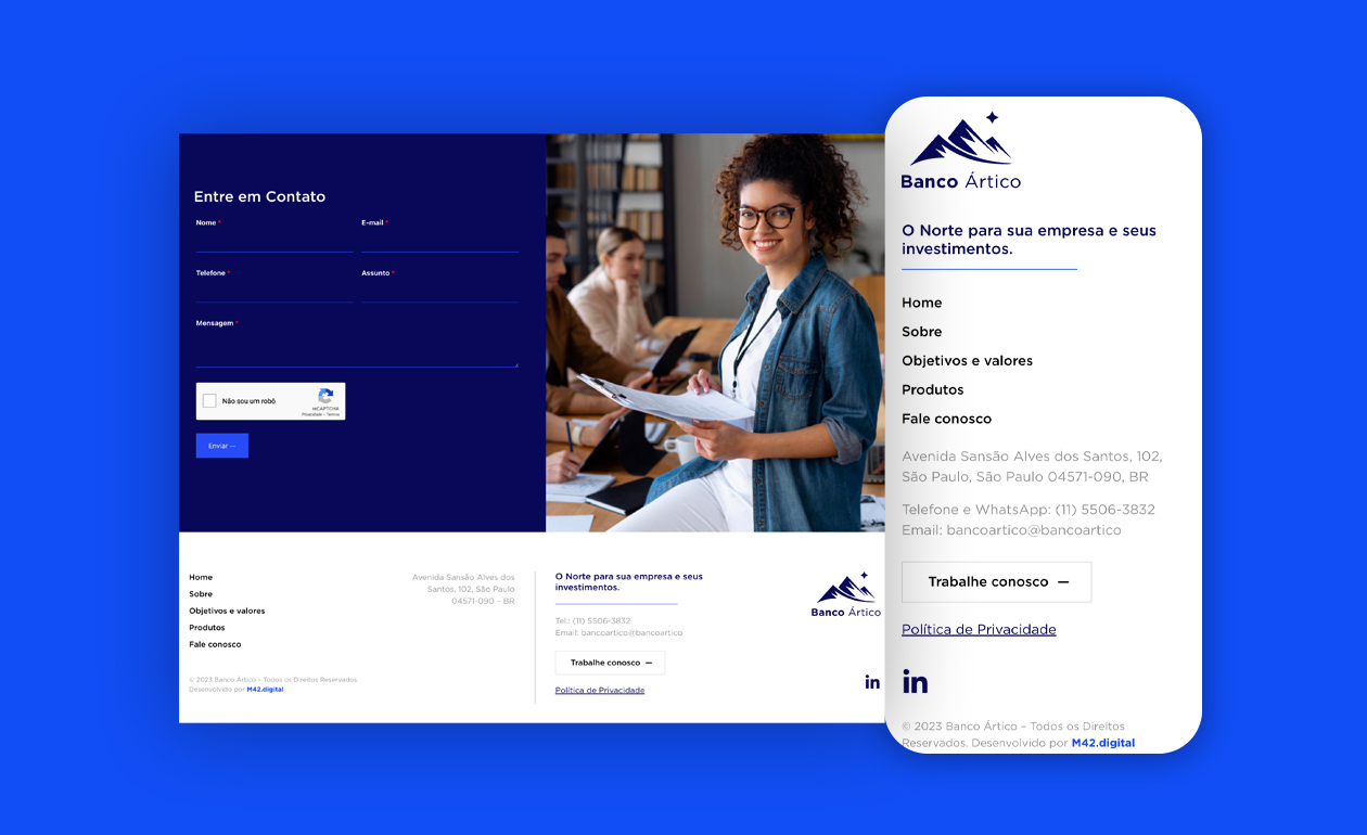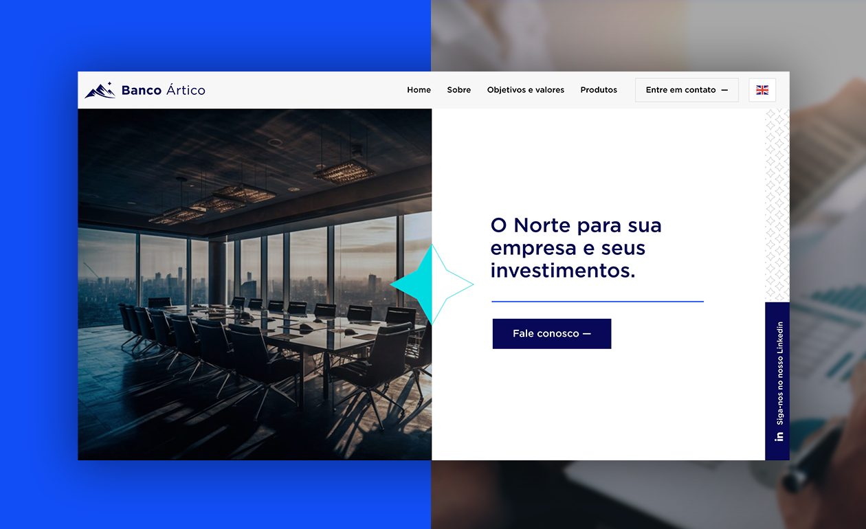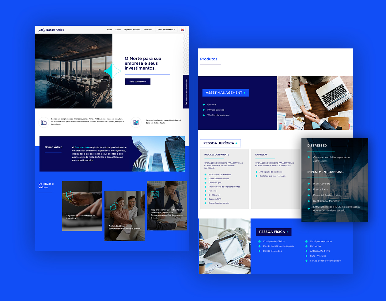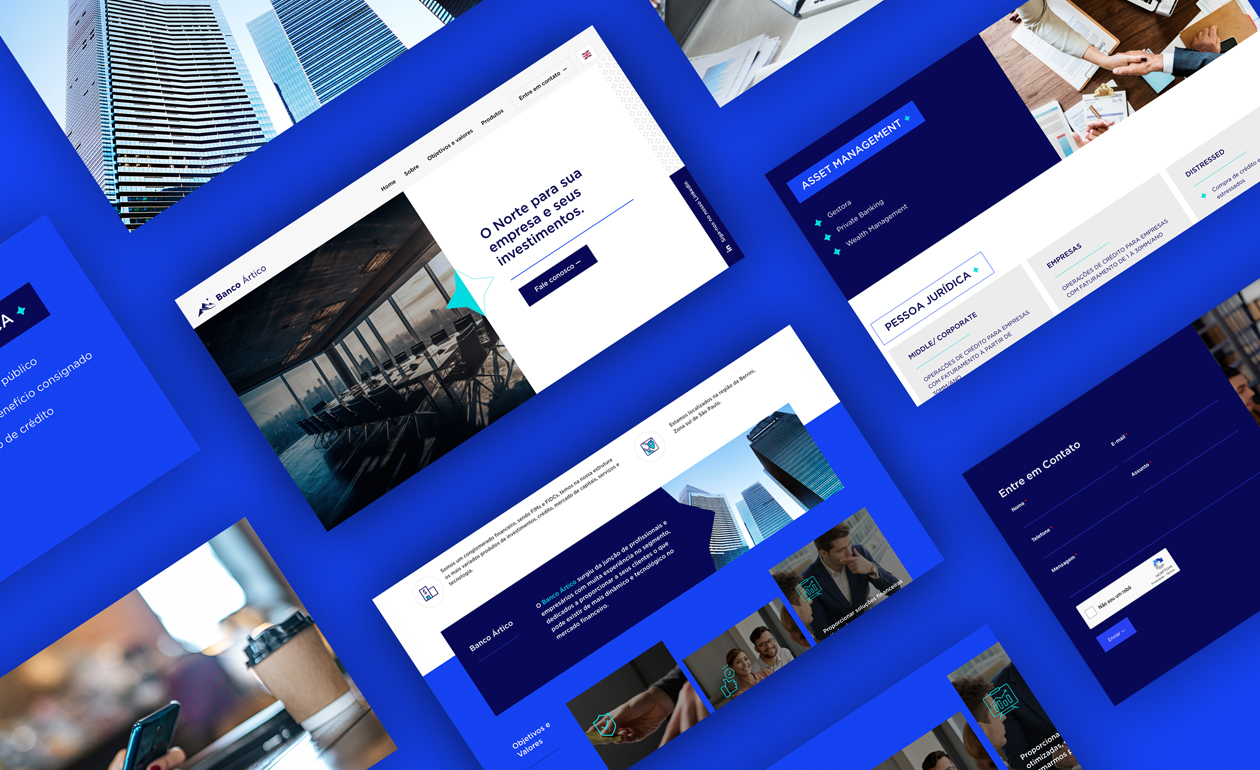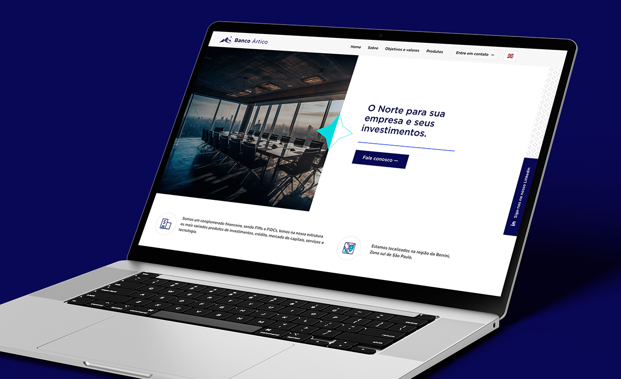 O Banco Ártico oferece o que há de mais tecnológico e dinâmico no setor financeiro. O nosso desafio era transmitir esse dinamismo na comunicação, já que a empresa conta com um amplo portfólio de produtos. Assim, consolidamos todos os serviços em um layout simples e objetivo, utilizando imagens e cores que não só apresentam a essência da empresa ao mercado, como também fortalecem a identidade da marca.
