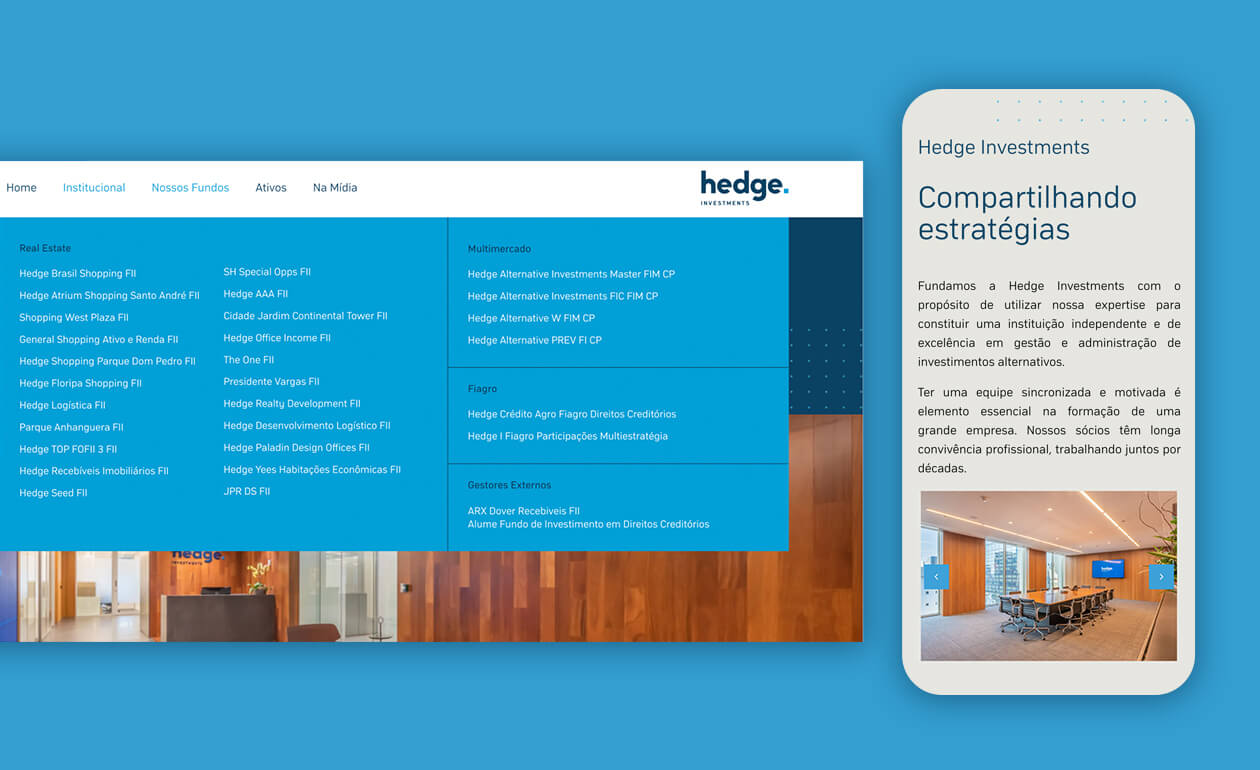 Desenvolvimento do site institucional de uma das maiores gestoras de ativos alternativos e uma das mais reconhecidas administradoras fiduciárias do Brasil. A M42 foi responsável pelo redesign do site, com os fundos e ativos detalhados para que a própria equipe da Hedge Invest pudesse atualizar as informações.