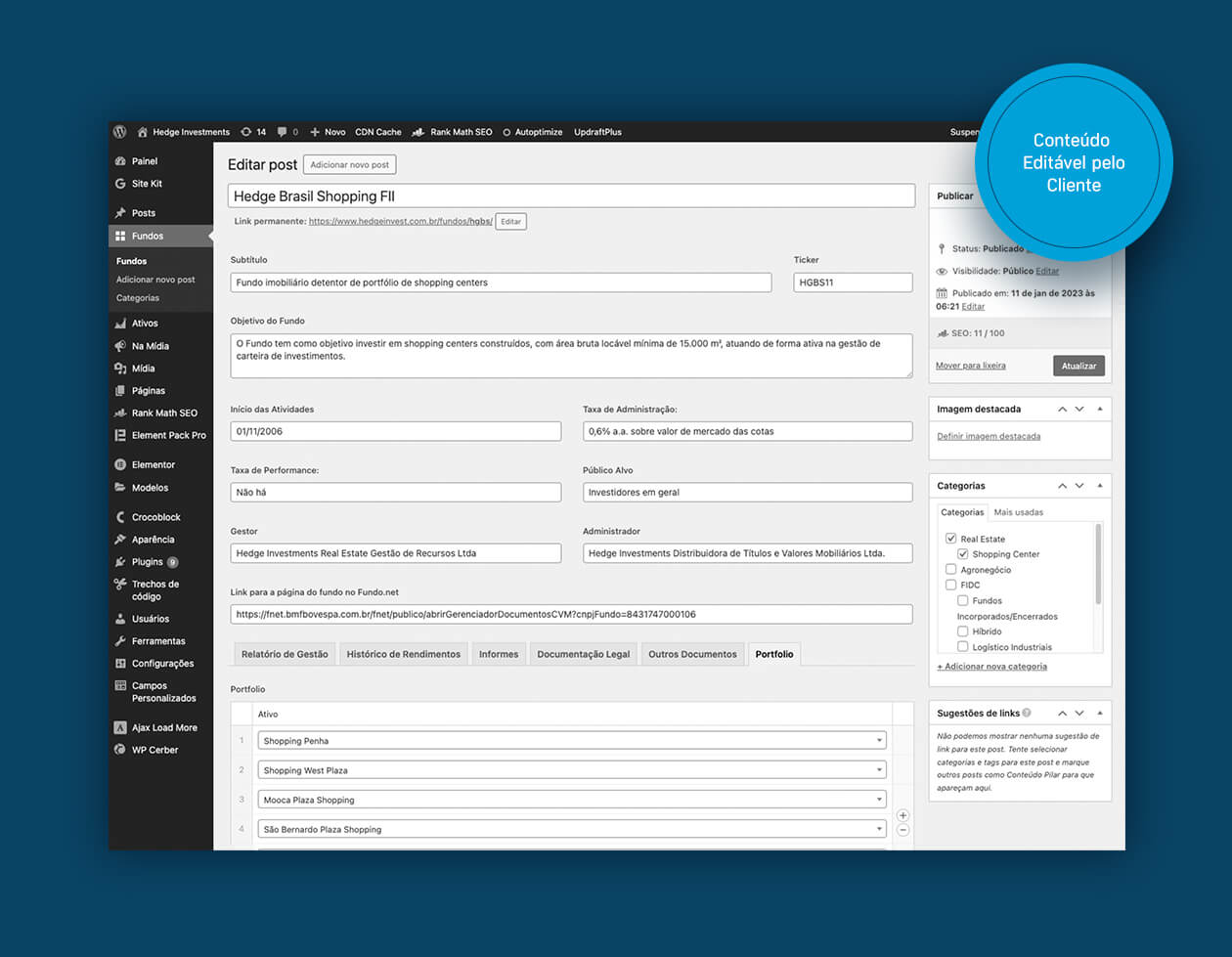 Pensando no dia a dia do cliente, era fundamental que o processo de atualização dos PFDs de cada fundo fosse simples e objetivo. Assim, criamos uma estrutura de links, PDFs e textos de fácil edição. Com um painel intuitivo que não tem a necessidade de usar códigos, a atualização é realizada apenas inserindo os nomes dos arquivos.